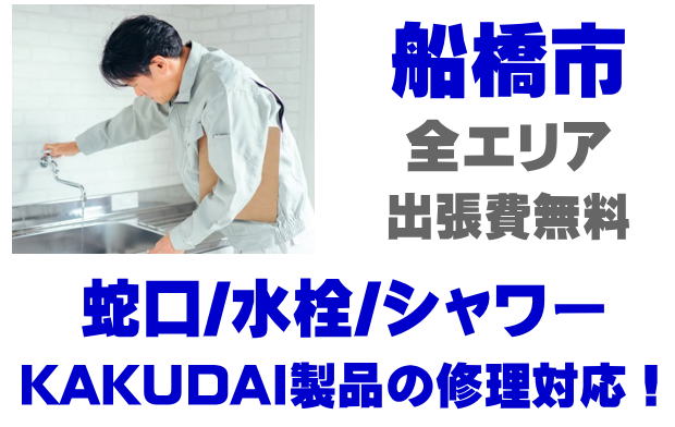 船橋市で水栓メーカーKAKUDAIの修理業者をお探しなら当社までお気軽にお問い合わせください。蛇口の水漏れ、シャワーの故障などカクダイ製に関するトラブルなら何でもご相談ください。